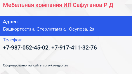 Мебельная компания, ИП Сафуганов Р.Д. по адресу Башкортостан, Стерлитамак, Юсупова, 2а в дальнейшем Организация, размещена в следующих категориях:
