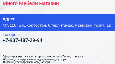 Много Мебели, магазин по адресу 453118, Башкортостан, Стерлитамак, Раевский тракт, 1к в дальнейшем Организация, размещена в следующих категориях: