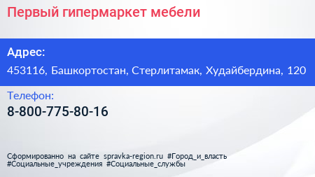 Первый гипермаркет мебели по адресу 453116, Башкортостан, Стерлитамак, Худайбердина, 120 в дальнейшем Организация, размещена в следующих категориях: