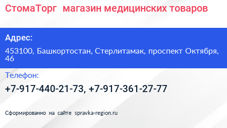СтомаТорг+, магазин медицинских товаров по адресу 453100, Башкортостан, Стерлитамак, проспект Октября, 46 в дальнейшем Организация, размещена в следующих категориях: