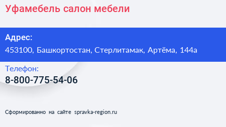 Уфамебель, салон мебели по адресу 453100, Башкортостан, Стерлитамак, Артёма, 144а в дальнейшем Организация, размещена в следующих категориях:
