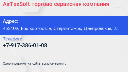 AirTexSoft, торгово-сервисная компания по адресу 453109, Башкортостан, Стерлитамак, Днепровская, 7а в дальнейшем Организация, размещена в следующих категориях:
