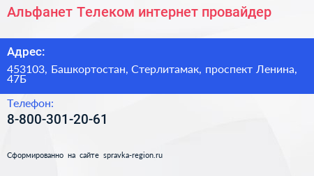 Альфанет Телеком, интернет-провайдер по адресу 453103, Башкортостан, Стерлитамак, проспект Ленина, 47Б в дальнейшем Организация, размещена в следующих категориях: