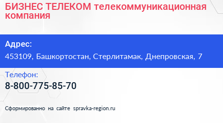 БИЗНЕС ТЕЛЕКОМ, телекоммуникационная компания по адресу 453109, Башкортостан, Стерлитамак, Днепровская, 7 в дальнейшем Организация, размещена в следующих категориях: