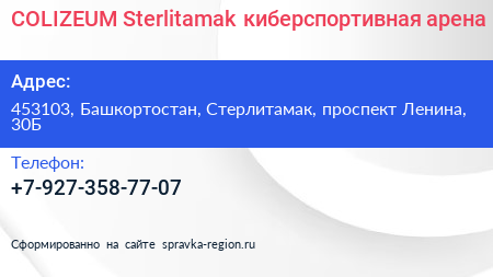 COLIZEUM Sterlitamak, киберспортивная арена по адресу 453103, Башкортостан, Стерлитамак, проспект Ленина, 30Б в дальнейшем Организация, размещена в следующих категориях: