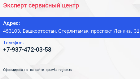 Эксперт, сервисный центр по адресу 453103, Башкортостан, Стерлитамак, проспект Ленина, 31 в дальнейшем Организация, размещена в следующих категориях: