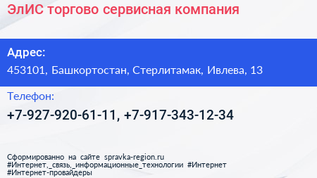 ЭлИС, торгово-сервисная компания по адресу 453101, Башкортостан, Стерлитамак, Ивлева, 13 в дальнейшем Организация, размещена в следующих категориях: