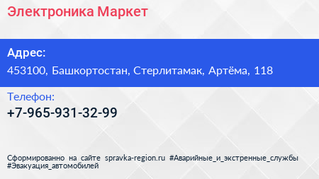 Электроника Маркет по адресу 453100, Башкортостан, Стерлитамак, Артёма, 118 в дальнейшем Организация, размещена в следующих категориях: