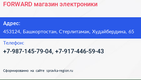 FORWARD, магазин электроники по адресу 453124, Башкортостан, Стерлитамак, Худайбердина, 65 в дальнейшем Организация, размещена в следующих категориях:
