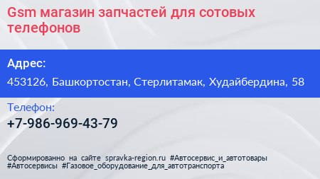 Gsm, магазин запчастей для сотовых телефонов по адресу 453126, Башкортостан, Стерлитамак, Худайбердина, 58 в дальнейшем Организация, размещена в следующих категориях:
