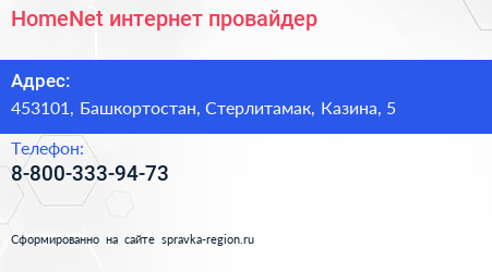 HomeNet, интернет-провайдер по адресу 453101, Башкортостан, Стерлитамак, Казина, 5 в дальнейшем Организация, размещена в следующих категориях: