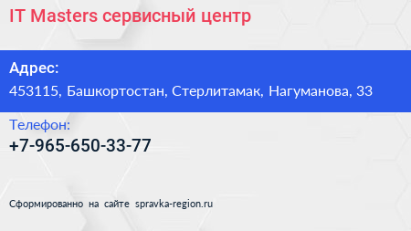 IT-Masters, сервисный центр по адресу 453115, Башкортостан, Стерлитамак, Нагуманова, 33 в дальнейшем Организация, размещена в следующих категориях: