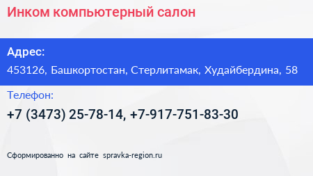 Инком, компьютерный салон по адресу 453126, Башкортостан, Стерлитамак, Худайбердина, 58 в дальнейшем Организация, размещена в следующих категориях: