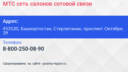 МТС, сеть салонов сотовой связи по адресу 453120, Башкортостан, Стерлитамак, проспект Октября, 39 в дальнейшем Организация, размещена в следующих категориях: