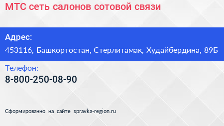 МТС, сеть салонов сотовой связи по адресу 453116, Башкортостан, Стерлитамак, Худайбердина, 89Б в дальнейшем Организация, размещена в следующих категориях: