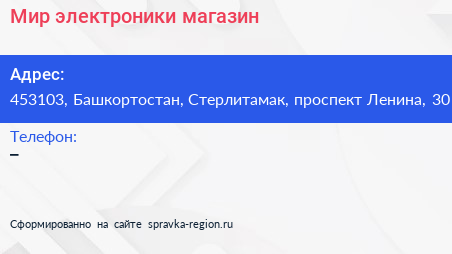 Мир электроники, магазин по адресу 453103, Башкортостан, Стерлитамак, проспект Ленина, 30 в дальнейшем Организация, размещена в следующих категориях: