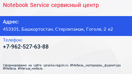 Notebook Service, сервисный центр по адресу 453101, Башкортостан, Стерлитамак, Гоголя, 2 к2 в дальнейшем Организация, размещена в следующих категориях: