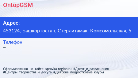 OntopGSM по адресу 453124, Башкортостан, Стерлитамак, Комсомольская, 5 в дальнейшем Организация, размещена в следующих категориях: