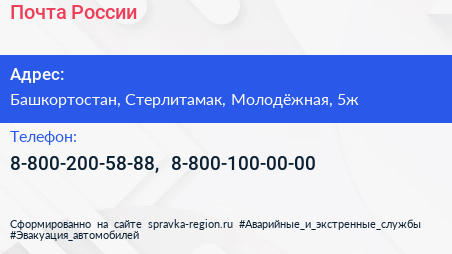 Почта России по адресу Башкортостан, Стерлитамак, Молодёжная, 5ж в дальнейшем Организация, размещена в следующих категориях:
