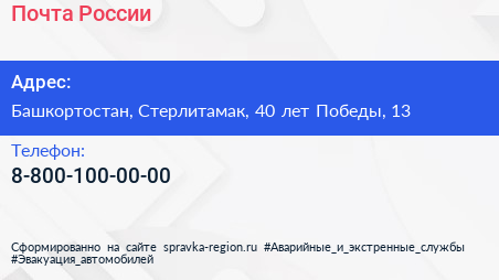Почта России по адресу Башкортостан, Стерлитамак, 40 лет Победы, 13 в дальнейшем Организация, размещена в следующих категориях: