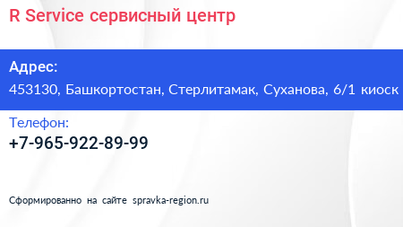 R Service, сервисный центр по адресу 453130, Башкортостан, Стерлитамак, Суханова, 6/1 киоск в дальнейшем Организация, размещена в следующих категориях: