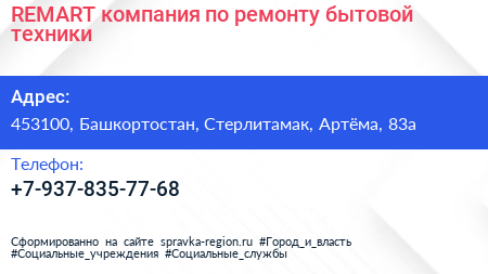 REMART, компания по ремонту бытовой техники по адресу 453100, Башкортостан, Стерлитамак, Артёма, 83а в дальнейшем Организация, размещена в следующих категориях: