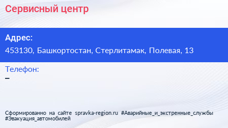 Сервисный центр по адресу 453130, Башкортостан, Стерлитамак, Полевая, 13 в дальнейшем Организация, размещена в следующих категориях: