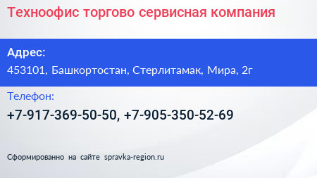 Техноофис, торгово-сервисная компания по адресу 453101, Башкортостан, Стерлитамак, Мира, 2г в дальнейшем Организация, размещена в следующих категориях:
