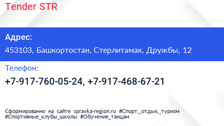 Tender.STR по адресу 453103, Башкортостан, Стерлитамак, Дружбы, 12 в дальнейшем Организация, размещена в следующих категориях: