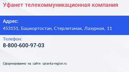 Уфанет, телекоммуникационная компания по адресу 453151, Башкортостан, Стерлитамак, Лазурная, 11 в дальнейшем Организация, размещена в следующих категориях:
