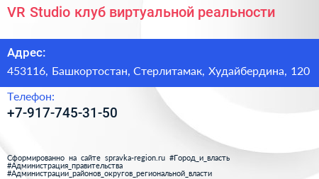 VR Studio, клуб виртуальной реальности по адресу 453116, Башкортостан, Стерлитамак, Худайбердина, 120 в дальнейшем Организация, размещена в следующих категориях: