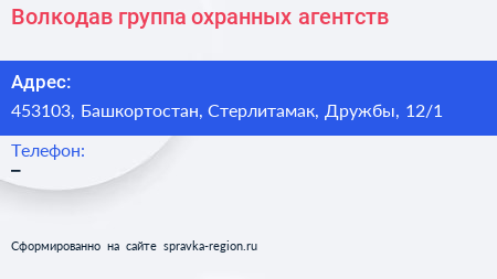 Волкодав, группа охранных агентств по адресу 453103, Башкортостан, Стерлитамак, Дружбы, 12/1 в дальнейшем Организация, размещена в следующих категориях: