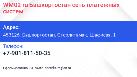 WM02.ru Башкортостан, сеть платежных систем по адресу 453126, Башкортостан, Стерлитамак, Шафиева, 1 в дальнейшем Организация, размещена в следующих категориях: