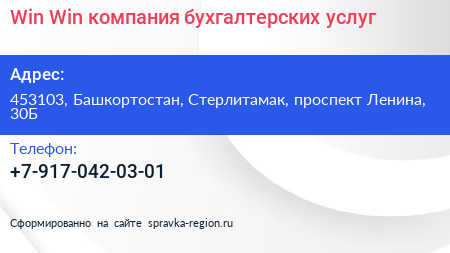 Win-Win, компания бухгалтерских услуг по адресу 453103, Башкортостан, Стерлитамак, проспект Ленина, 30Б в дальнейшем Организация, размещена в следующих категориях: