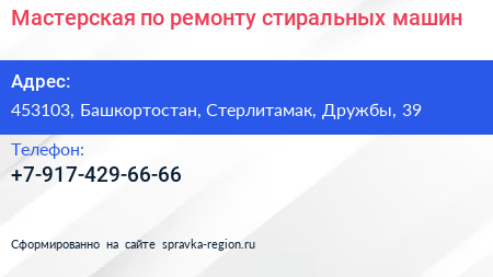 Мастерская по ремонту стиральных машин по адресу 453103, Башкортостан, Стерлитамак, Дружбы, 39 в дальнейшем Организация, размещена в следующих категориях: