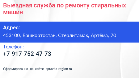 Выездная служба по ремонту стиральных машин по адресу 453100, Башкортостан, Стерлитамак, Артёма, 70 в дальнейшем Организация, размещена в следующих категориях: