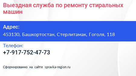 Выездная служба по ремонту стиральных машин по адресу 453130, Башкортостан, Стерлитамак, Гоголя, 118 в дальнейшем Организация, размещена в следующих категориях: