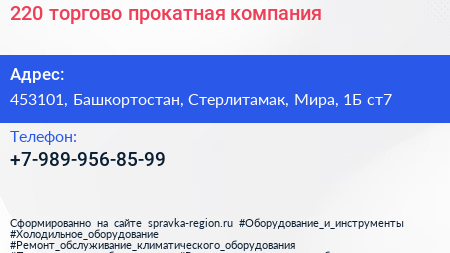220, торгово-прокатная компания по адресу 453101, Башкортостан, Стерлитамак, Мира, 1Б ст7 в дальнейшем Организация, размещена в следующих категориях: