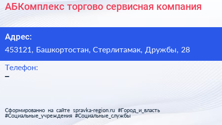 АБКомплекс, торгово-сервисная компания по адресу 453121, Башкортостан, Стерлитамак, Дружбы, 28 в дальнейшем Организация, размещена в следующих категориях: