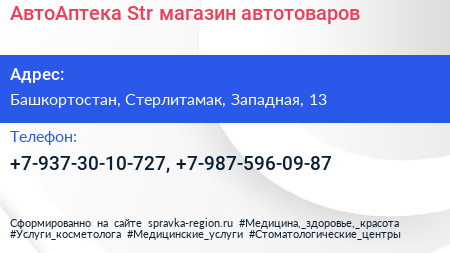 АвтоАптека-Str, магазин автотоваров по адресу Башкортостан, Стерлитамак, Западная, 13 в дальнейшем Организация, размещена в следующих категориях: