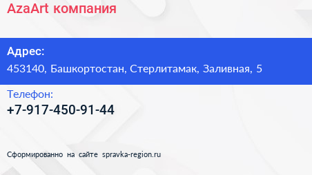AzaArt, компания по адресу 453140, Башкортостан, Стерлитамак, Заливная, 5 в дальнейшем Организация, размещена в следующих категориях: