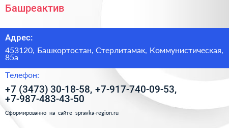 Башреактив по адресу 453120, Башкортостан, Стерлитамак, Коммунистическая, 85а в дальнейшем Организация, размещена в следующих категориях: