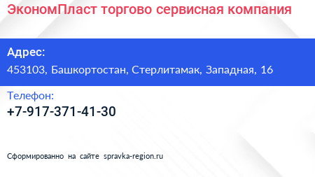 ЭкономПласт, торгово-сервисная компания по адресу 453103, Башкортостан, Стерлитамак, Западная, 16 в дальнейшем Организация, размещена в следующих категориях: