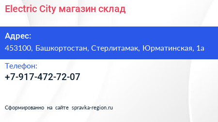 Electric City, магазин-склад по адресу 453100, Башкортостан, Стерлитамак, Юрматинская, 1а в дальнейшем Организация, размещена в следующих категориях: