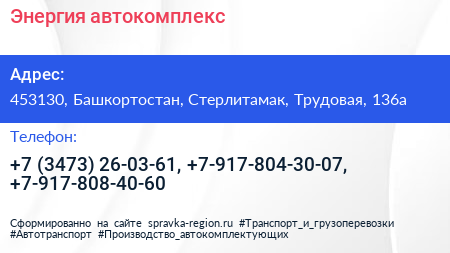 Энергия, автокомплекс по адресу 453130, Башкортостан, Стерлитамак, Трудовая, 136а в дальнейшем Организация, размещена в следующих категориях: