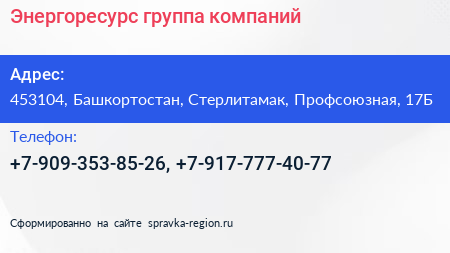 Энергоресурс, группа компаний по адресу 453104, Башкортостан, Стерлитамак, Профсоюзная, 17Б в дальнейшем Организация, размещена в следующих категориях: