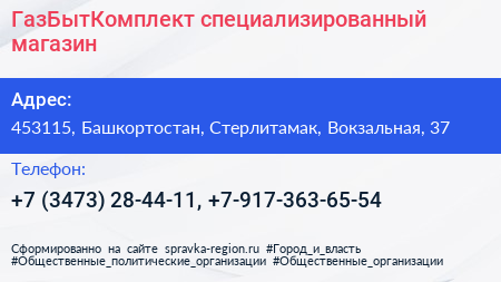 ГазБытКомплект, специализированный магазин по адресу 453115, Башкортостан, Стерлитамак, Вокзальная, 37 в дальнейшем Организация, размещена в следующих категориях: