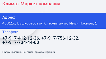Климат Маркет, компания по адресу 453116, Башкортостан, Стерлитамак, Имая Насыри, 1 в дальнейшем Организация, размещена в следующих категориях: