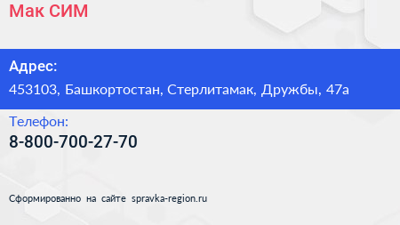 Мак СИМ по адресу 453103, Башкортостан, Стерлитамак, Дружбы, 47а в дальнейшем Организация, размещена в следующих категориях: