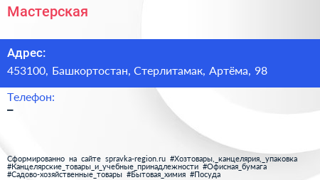 Мастерская по адресу 453100, Башкортостан, Стерлитамак, Артёма, 98 в дальнейшем Организация, размещена в следующих категориях: